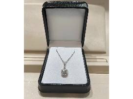 The necklace is a halo pendant set in 14 karat white gold. With a total carat weight of 0.85, the necklace features a 0.68 carat round diamond surrounded by 17 small diamonds and has a retail value of $3250.