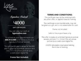 - Signature Portrait Studio Session and a custom museum-grade 11 x 14 portrait (Priced at $4,000 OR a $4,000 print credit for a larger portrait print) created by Master Portrait Artist Kevin G. Saunders. The client may choose between a color canvas or black and white on a silver gelatin print, mounted and ready for framing.