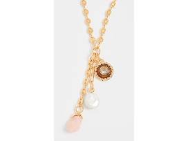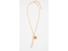 Long silhouette, gold-tone chain, multi-charm detail, adjustable