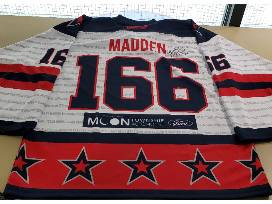You're bidding on a signed, event issued 2023 Celebrity Hockey Face-off Colonials white #166 "The Super Genius" Mark Madden jersey!