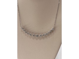 14k White Gold Curved Bar Necklace containing 13 full-cut diamonds, each individually set in round miracle settings, graduating size.