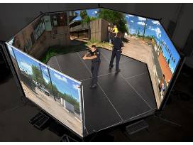 You will be equipped with a special gun and other equipment which will be used in the simulation. When the gun is fired; you will hear the gunfire and feel the reverberations from the simulated firearm. Scenarios require your full attention and may occur on one of the screens behind you.