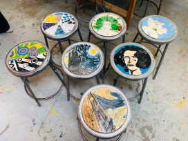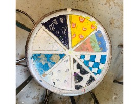 Help us add a fun, unique and original spark of color and personality to the art room with (1) hand painted stool top!