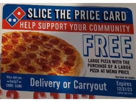 Take Out Bonus! Domino Slice the Price Card-Free Large Pizza with the purchase of a large Pizza at Menu Price. Or buy 10 large pizzas get 10 free. Card good until 12-31-23.