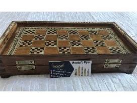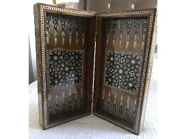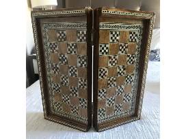 Box board where the pieces can be stored inside. The tile patterns on the board are all hand done one small piece at a time.