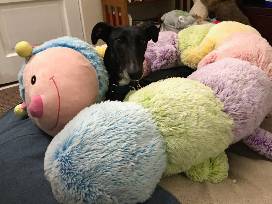 Jumbo 80" caterpillar snuggle toy, a favorite of greyhounds, for playtime and snuggle time.