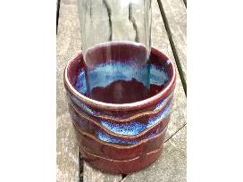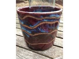 Handmade Stoneware vessel in rich cranberry glaze with blue accents. Wavy lines and drippy glazing create a peaceful, eye-catching effect.