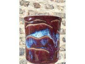 Handmade Stoneware vessel in rich cranberry glaze with blue accents. Wavy lines and drippy glazing create a peaceful, eye-catching effect.