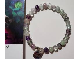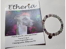 Bracelets are made with rainbow fluorite genuine gemstones; the hound tag is stainless steel.