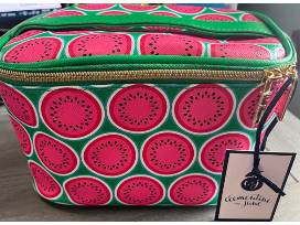 This bright pink & green cosmetics bag is perfect for any watermelon lover! Measuring 9" x 6" x 5" it will hold everything needed to keep your sun-kissed skin looking and feeling good. The adorable bag has a gold zipper closure and top handle for easy carrying.