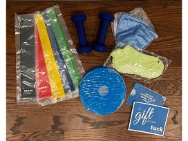 Not ready to reenter the yoga world in person ore prefer your workouts in the comfort of your own home? This is the perfect package for you! A one year subscription for unlimited online Barre & Yoga classes at Tuck Barre & Yoga, as well as a barre box which includes 5 weighted bands, 2 2 lb. hand weights, sliders, non-slip socks and an inflatable ball.
