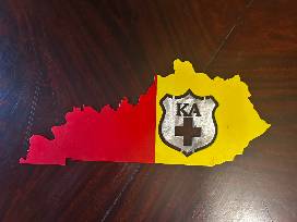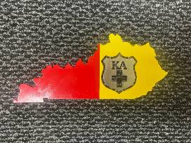 Custom-made, this stunning piece is a metal cut shape of Kentucky with the KA letters and cross cut out and painted crimson and gold to resemble the KA flag. Measuring approximately 7" long by 12" tall and about 1/4" thick, this is a must-have for any member of Kappa Alpha Order, especially those brothers living in Kentucky!