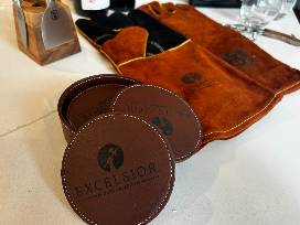 Crafted for comfort and safety at the grill. - 1 Leather Coaster Set with Holder