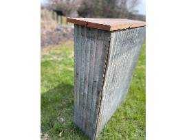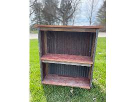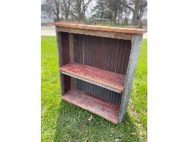 Dickson-Murst Farm volunteer Jeff Nakaerts rafted this one of a kind rustic shelf using repurposed barn materials. Barnwood shelves are encased in naturally patinaed corrugated tin. This is a statement piece, perfect for an entryway, small bookcase, to show off potted plants on your front porch, or anywhere else you'd like to add a rustic touch. Measures