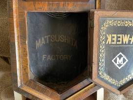 This refurbished antique pendulum clock will both keep the time and pique the interest of your guests. The glass door on the front is lettered "A-Week" and inside the cabinet is "Matsushita Factory". Chimes on the half hour and on the hour, but the chimes can be disconnected if desired. The pendulum has also been disconnected for display and transport, but instructions for reconnection as well as the clock key are included.