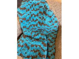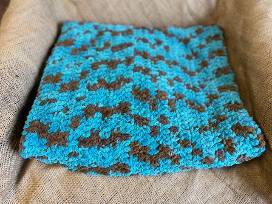 Crafter and volunteer Kim Olson has created this "Riffles" themed lap blanket in tones of blue. It's the perfect size and weight to ward off the chill while enjoying a spring evening on the porch, relaxing on the couch or over your lap on a carriage ride.