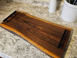 Hand crafted live-edge 20-inch black walnut charcuterie board with handles. Serving in style!