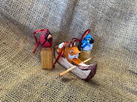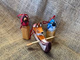 Three of the most lively characters of the woods have been fancifully handcarved by Friends of the Dayton Bluffs volunteer Bill Reid. This canoeing squirrel, cardinal, and blue jay are fitted with a string for hanging on a holiday tree, or remove the string and bring a woodsy vibe to any decor. Squirrel is 5" wide by 3" tall, Blue Jay and Cardinal are approximately 4" tall.