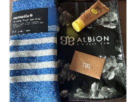 $150 Gift card, Sunbum sunscreen, and Nomadix towel.