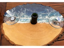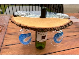 Basswood Wine Caddy with Ocean inspired resin art with 2 hand painted wine glasses by artist Rising Tide Resin Designs.