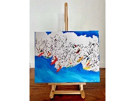 South California is the place for surfers. People love ocean and want to be a part of it. I feel surfing is one of the sports that can connect people and ocean together. We love the blue waves, it feels so awesome to ride on it. In this art, I captured the movement of the surfers riding on the waves. I use my signature inky line to be the connection between the surfers and the ocean. Everything has its own colors, so does the ocean. I used vibrant Korean gouache colors for the surfers and the blue ocean, and the ink pen lines are the connection waves in between.