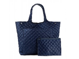 Ultra light weight quilted puffer tote with large exterior slip pocket and interior zip and slip pockets. Large removable wristlet pouch.