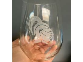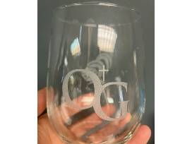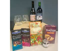 Wine basket with two bottles of wine, 6 custom O'Gorman sketched wine glasses, crackers, chocolate. Plus, noodles and pesto that were brought back from Italy.