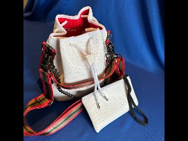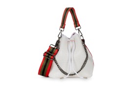 Neoprene bucket bag with side stripe detailing and additional wristlet pouch. Features a short handle strap and adjustable crossbody strap.