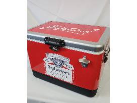 Just in time for the spring and summer outdoor activities and events, this handsome 54 QT red Budweiser logo cooler from H.W. Herrell Distributing Co. with bowtie logo on lid, steel side handles and bottle opener on the front.