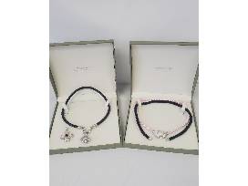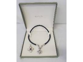 The other necklace features interchangeable pink and black 16" silky ropes with a sterling, rhinestone and pearl-like pendant.