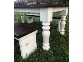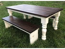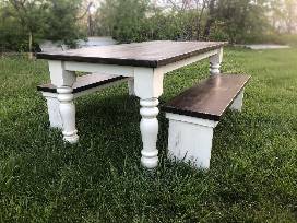 An incoming Lancer family made this beautiful farmhouse table and benches from solid wood and stained espresso for a dark finish. Table and bench legs are antique white with a shabby chic finish. Table measures 72" L x 38" W x 31" H.