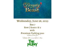 You and a friend are going to see the Muny's production of Beauty and the Beast on Wednesday, June 28, 2023, with these two (2) Box Seats in Box 7, Row J, Seats 1 and 2, along with reserved premium parking.