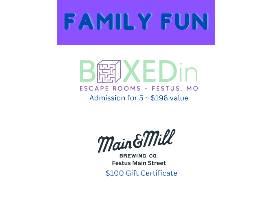 Enjoy a family night on the town with this gift certificate good for admission for five (5) at Boxed In Escape Rooms on Festus Main Street. Then enjoy lunch or dinner at Main & Mill Brewing Co. with this $100 gift certificate.