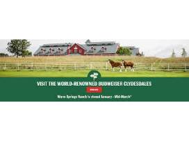 A fully informational experience, this Guided Walking Tour of Warm Springs Ranch for four (4) will bring you to spots and sights you'll never forget. See Clydesdale luxury trailers, our 1903 beer wagon, equipment worn by the Clydesdales out on the road, and more. Plus, meet Clydesdales of all ages! Guided tours are offered April 1st through October 31st by reservation only and space is limited.