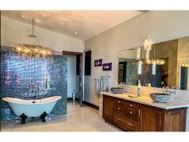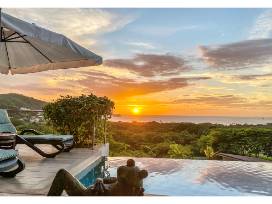 This aptly named destination in Guanacaste is just 20 minutes from Liberia International Airport (LIR) where the house is built into a lush hillside that provides natural privacy. The layout gives every room a panoramic view of the valley below and the ocean beyond. Four bedrooms sleep up to 8 guests, two with queen beds and one with two twin beds and the master bedroom with a king and a private terrace. Three of the bedrooms have picture-perfect ocean views. The master bath features a large shower and a standalone bathtub that looks out to sea.