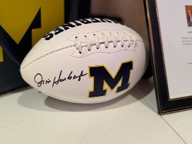 Autographed UofM Football by Jim Harbaugh plus everything you need for a fun UofM tailgate party! Two swing chairs, table, coolers, blanket, many accessories, cups, and much more.