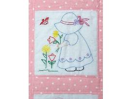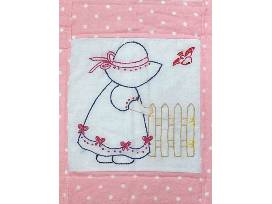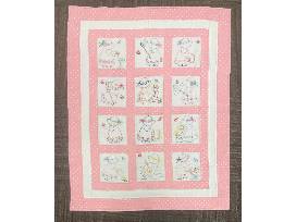 Hand-embroidered pink and white baby blanket lovingly made by a member of the Piecemakers. 44"W x 55" L