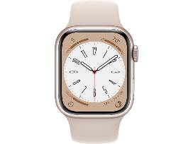This Apple Watch Series 8 has built-in GPS and cellular service, a 41mm starlight aluminum case with starlight sport band. S/M