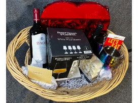 This basket includes a box of chocolates, 4 white wine glasses, led votive candles, 2 Mule mugs, 2 bottles of wine, $25 gift card to use at Cheesecake Factory, Chili's, Red Lobster, Cracker Barrel, or Panera. Also a $50 gift card to Gray's Mill.