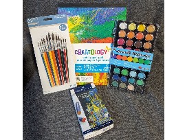 Basket of art supplies included in the win.