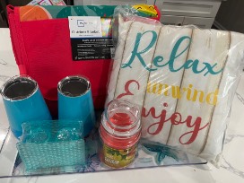 Check out this adorable seashell serving platter. It also includes an oversized blanket, 2 tumblers, salt and pepper shaker, napkin holder, candle and pillow.