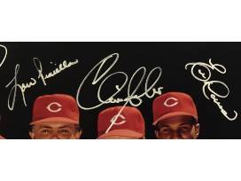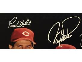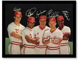 1Featured is an amazing image taken prior to Game 1 of the 1990 World Series, which opened at Riverfront Stadium. The photo features key members of the Cincinnati Reds 1990 "Wire To Wire" team that went on to capture the teams' 5th World Series title after their 4 game sweep of the Oakland A's. In the photo, are Manager Lou Piniella, outfielders Paul O'Neill and Eric Davis, third baseman Chris Sabo, and shortstop and newly inducted Hall of Famer, Barry Larkin. This amazing image has been hand signed by all 5.