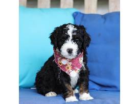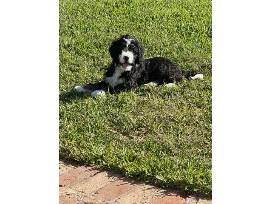 Red boy is a F1 Bernedoodle his mother is a Bernese mountain dog and his father is a moyen poodle ( moyen means -middle) the sire weighs 32 pounds he is between a standard and toy poodle .