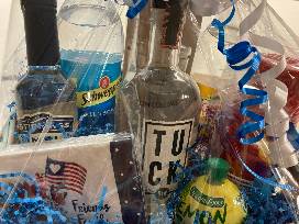 Let's get this party shaking! A bottle of gin, mixers, and the shaker.