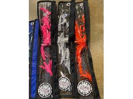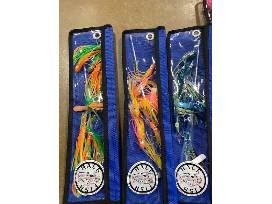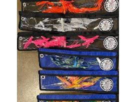 A beautiful assortment of spreader bars by Half Fish, featuring 3 small (fire tiger, anchovy, and candy corn) and 3 large (white, pink, and orange).