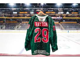 Pre-game worn Happy Howlidays jersey in size 56. This jersey was worn during warmups of the Coyotes vs. Canadiens game on December 19th, 2022 and autographed by #29 Barrett Hayton.