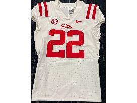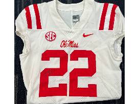 Authentic Ole Miss "22" white away jersey signed by Ole Miss Head Coach Lane Kiffin