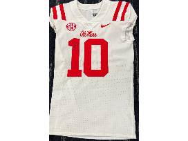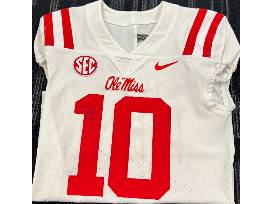 Authentic Ole Miss "10" white away jersey signed by Ole Miss Head Coach Lane Kiffin