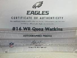 (1) Autographed photo from Eagles player #16 WR Quez Watkins. Includes certificate of authenticity.
