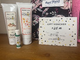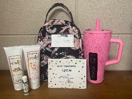 A beautifullined Vera Bradley lunch tote, Brumate, lotions, chair stick, and a $25 gift card to Hembeez